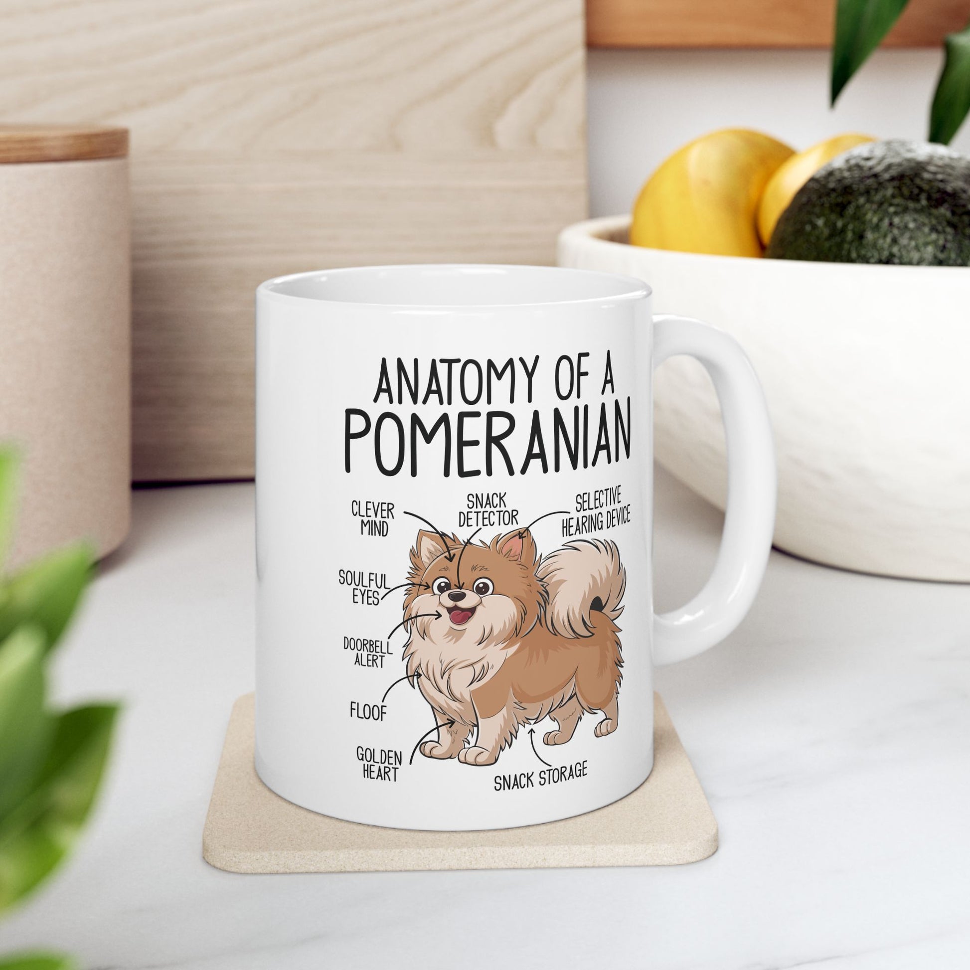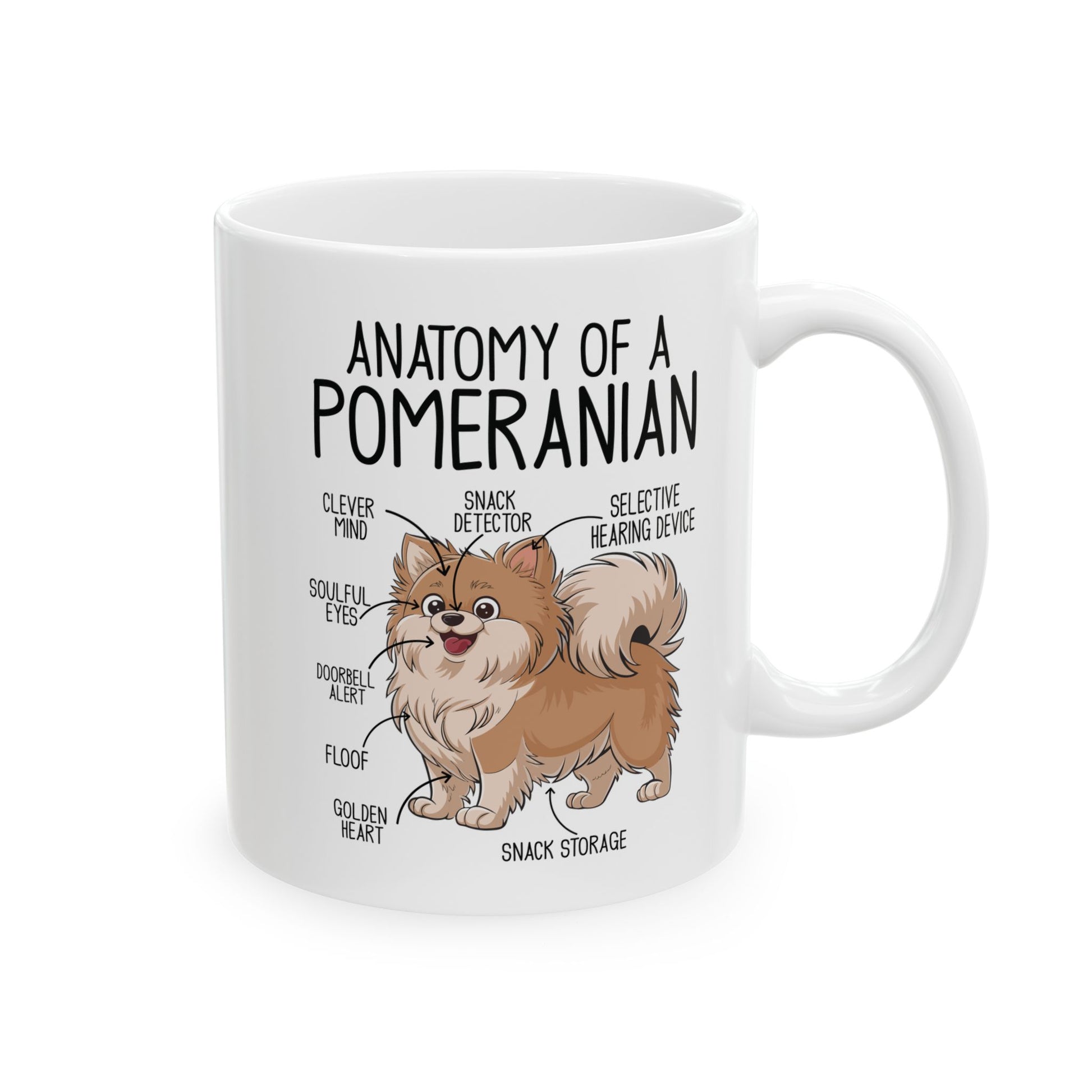 Start your day with a smile and a little Pomeranian humor! This "Anatomy of a Pomeranian" ceramic mug brings the lovable quirks of Poms to your morning coffee or tea. Featuring a cute cartoon illustration, each body part is labeled with a hilarious touch: the nose as the "Snack Detector," the mouth as the "Doorbell Alert," and the belly as "Snack Storage." It’s the perfect mug for Pom lovers who know and cherish these unique traits.