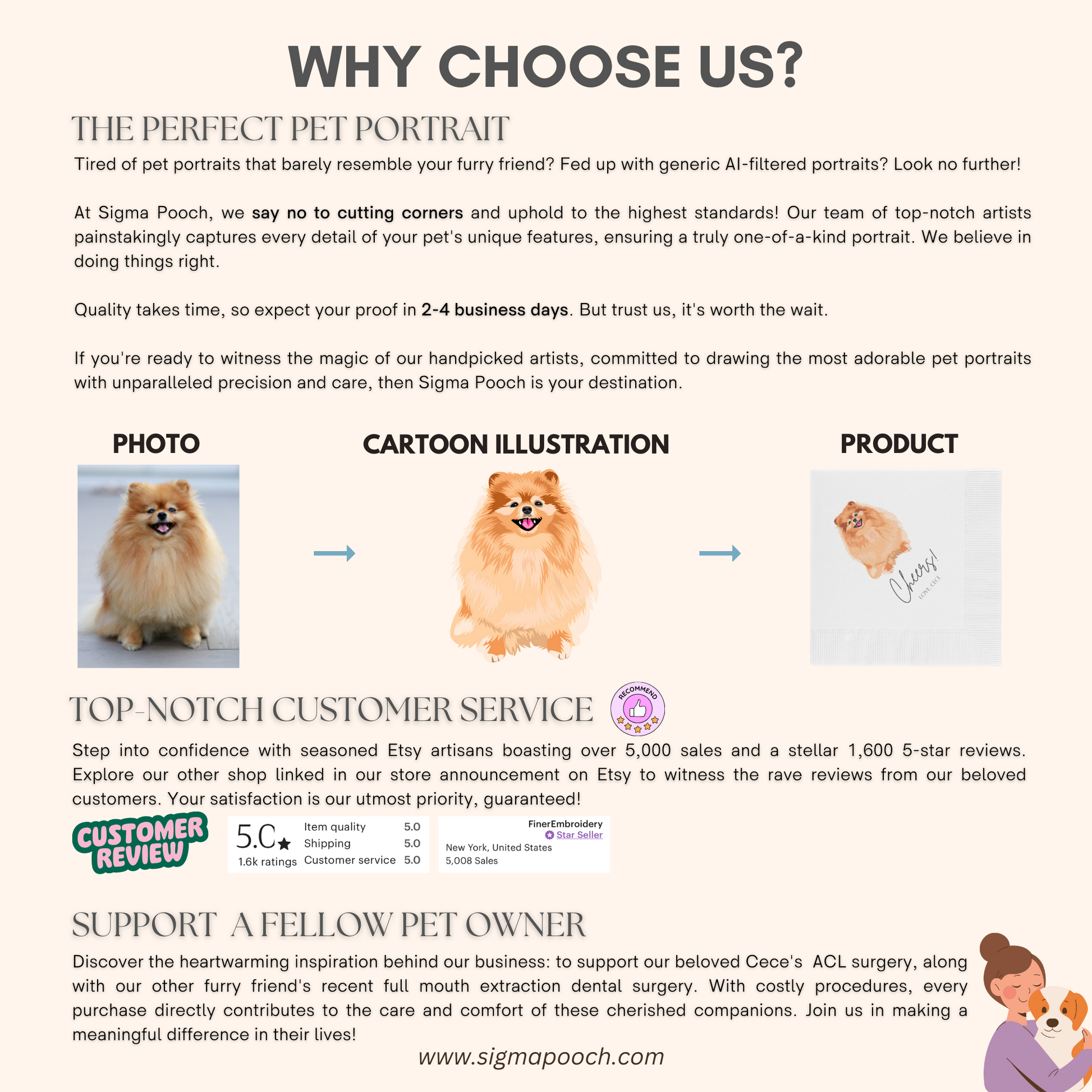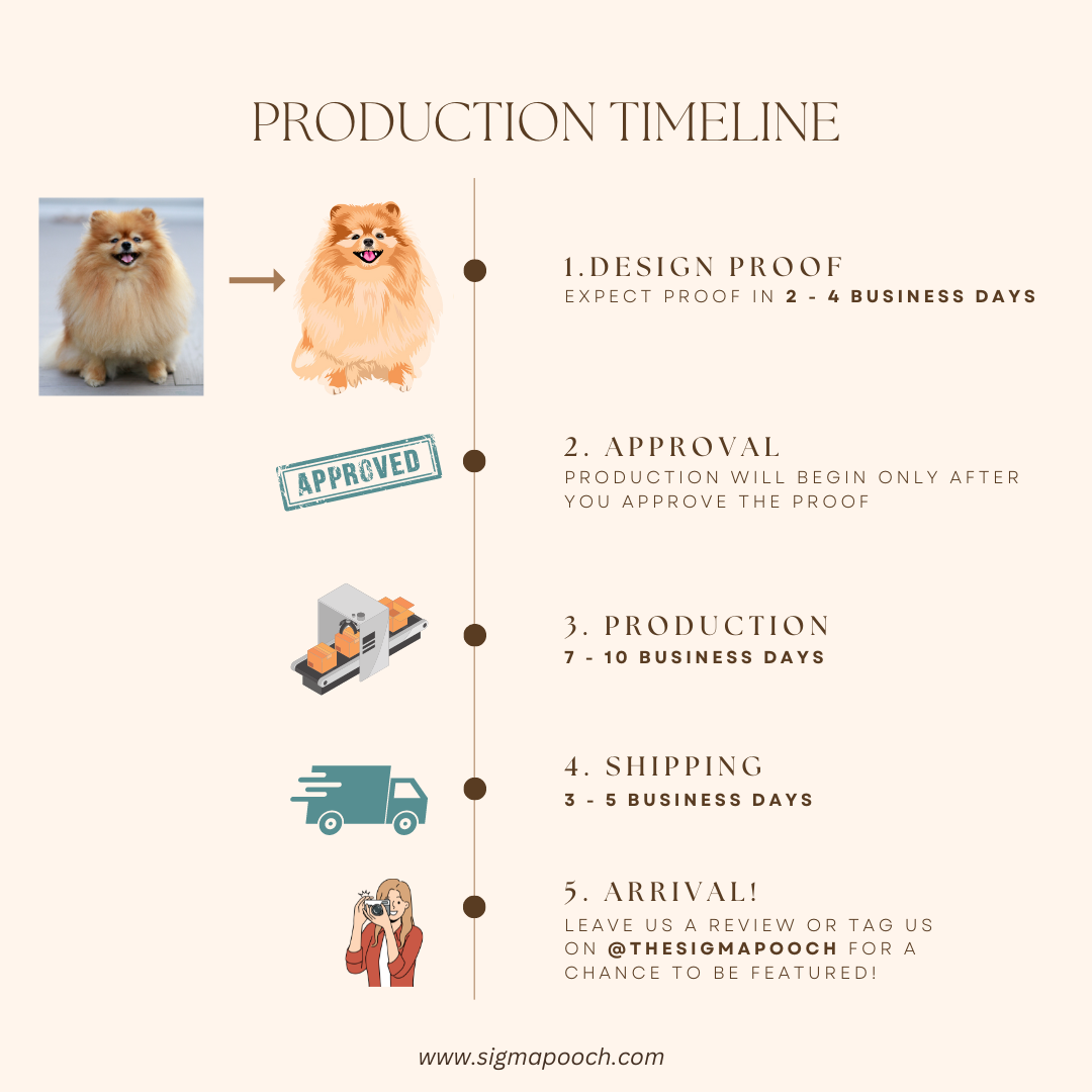 Upon receiving your pet photo, expect a message from us within 2 - 4 business days to review and approve the design proof. Please keep an eye on your inbox, including spam folders, and respond promptly upon receipt. If we do not hear back after 48 hours, we will assume approval and proceed with production.