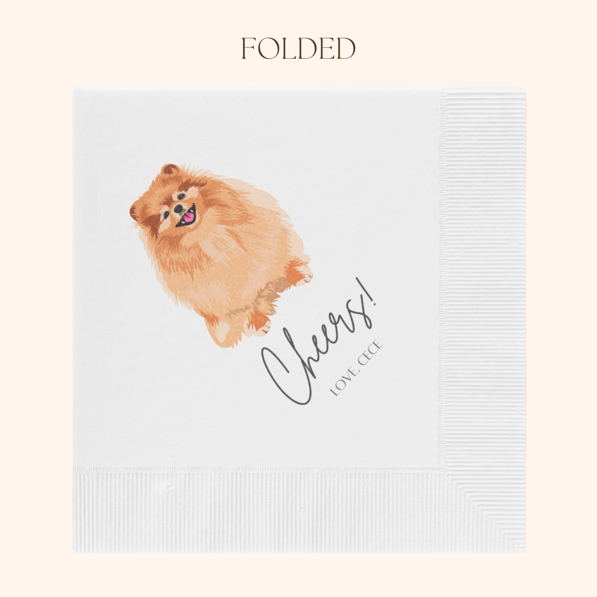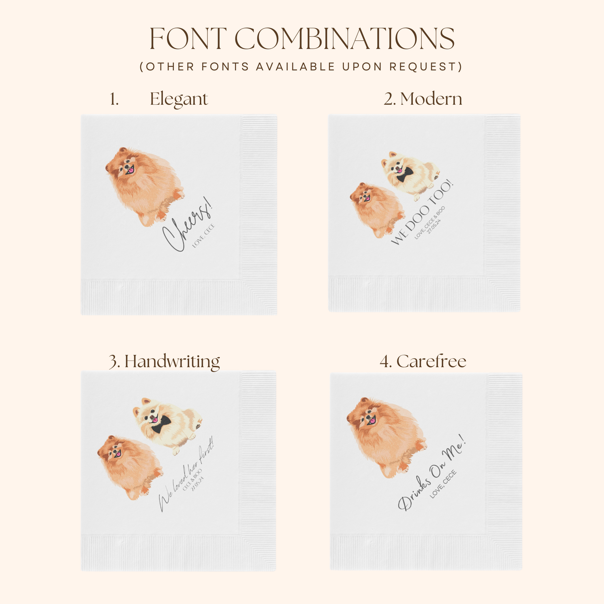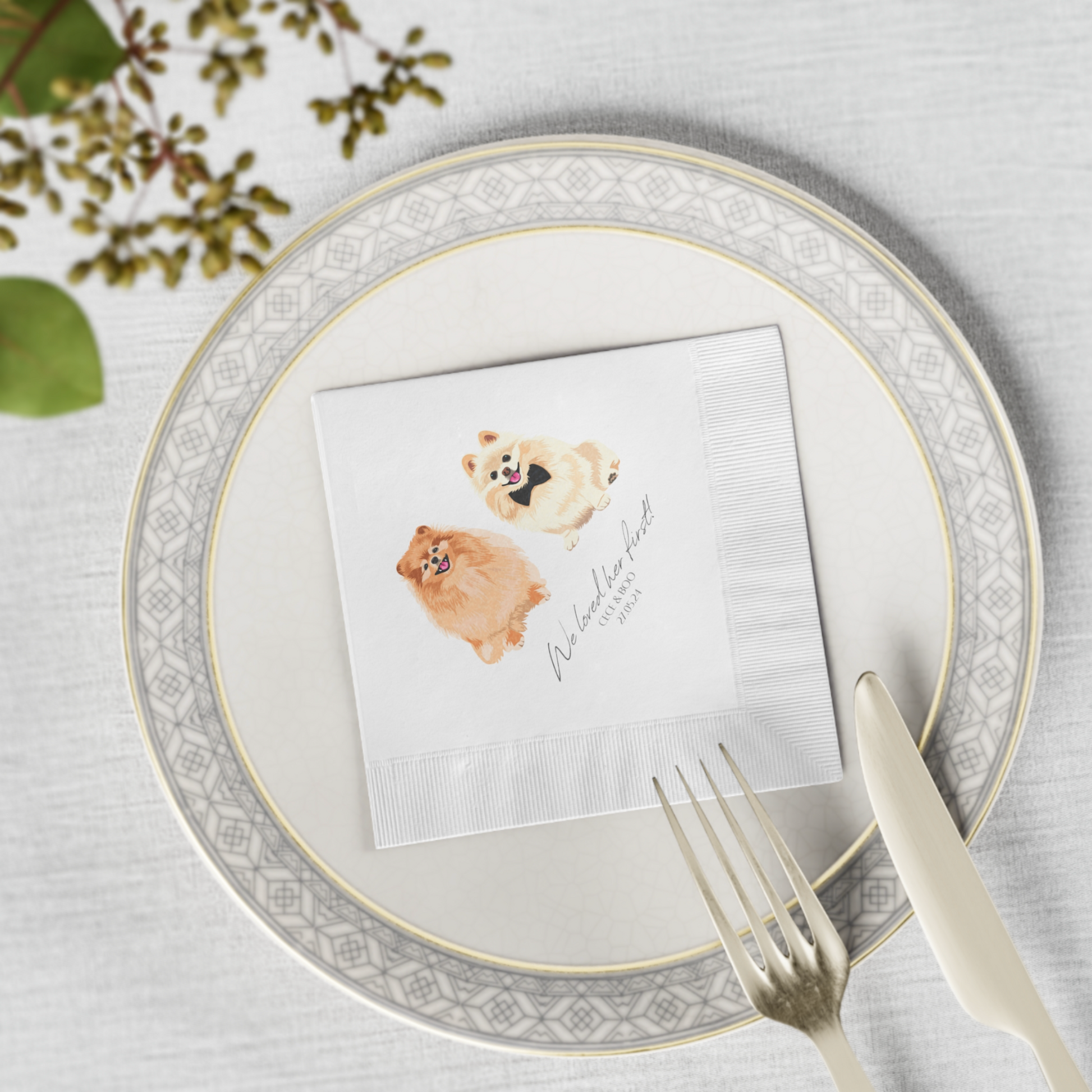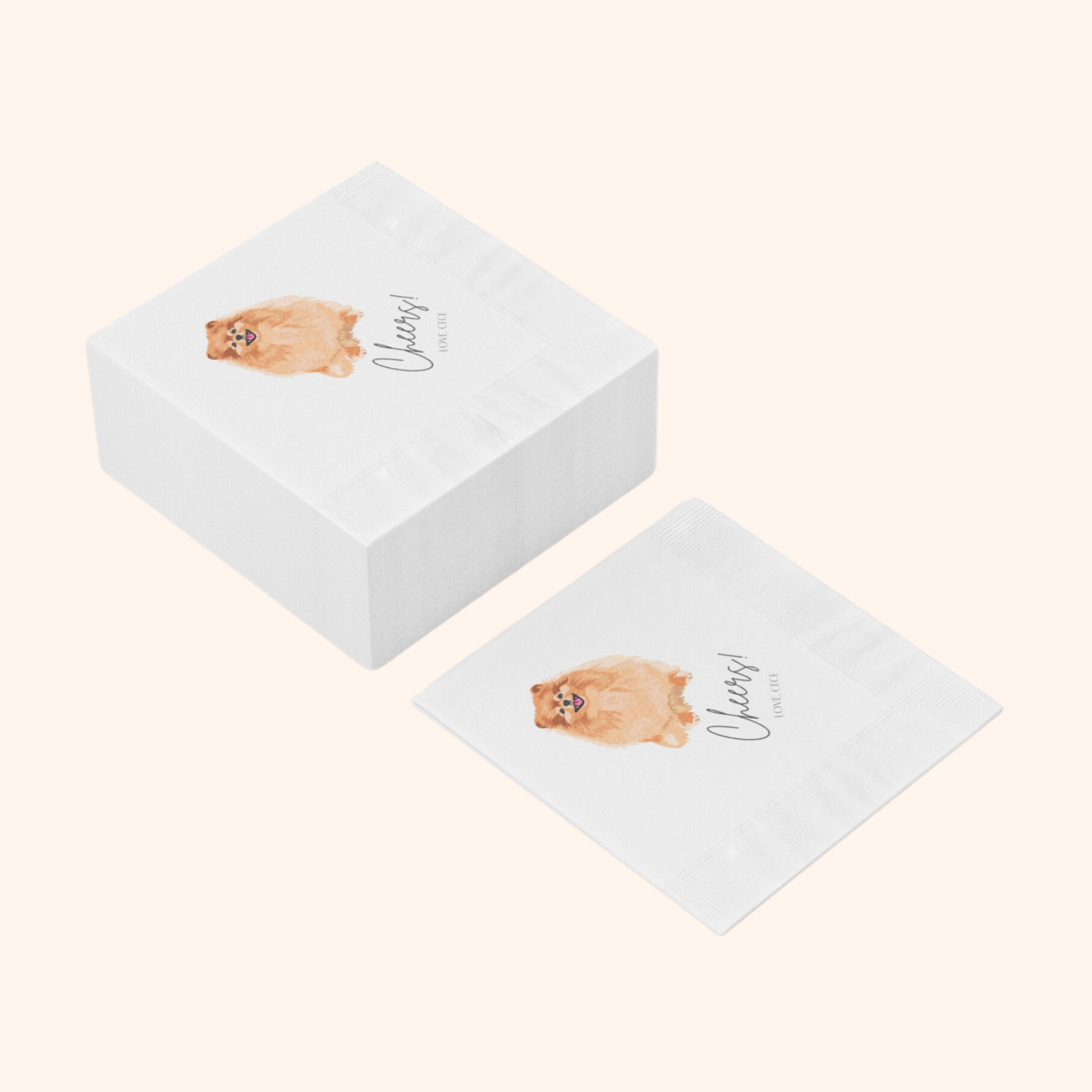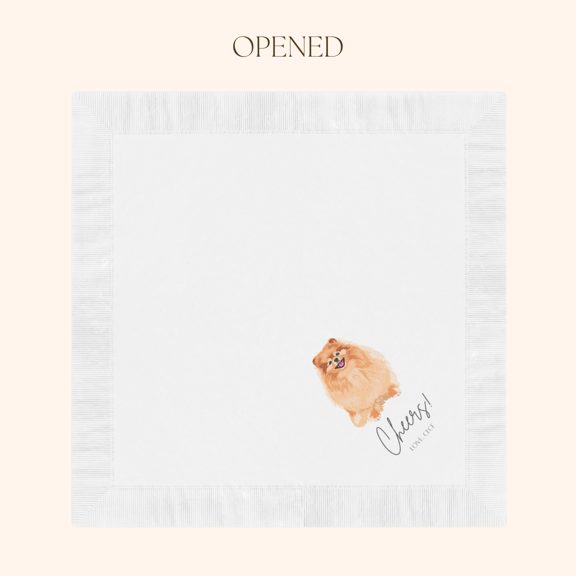 Bring your cherished fur babies into your wedding celebration with our personalized pet cocktail napkins, perfect for adding a unique and heartwarming touch to your special day. Custom cocktail napkins are a must-have for any event, offering a delightful detail that guests will love. We recommend ordering 2-3 napkins per guest for your celebration.