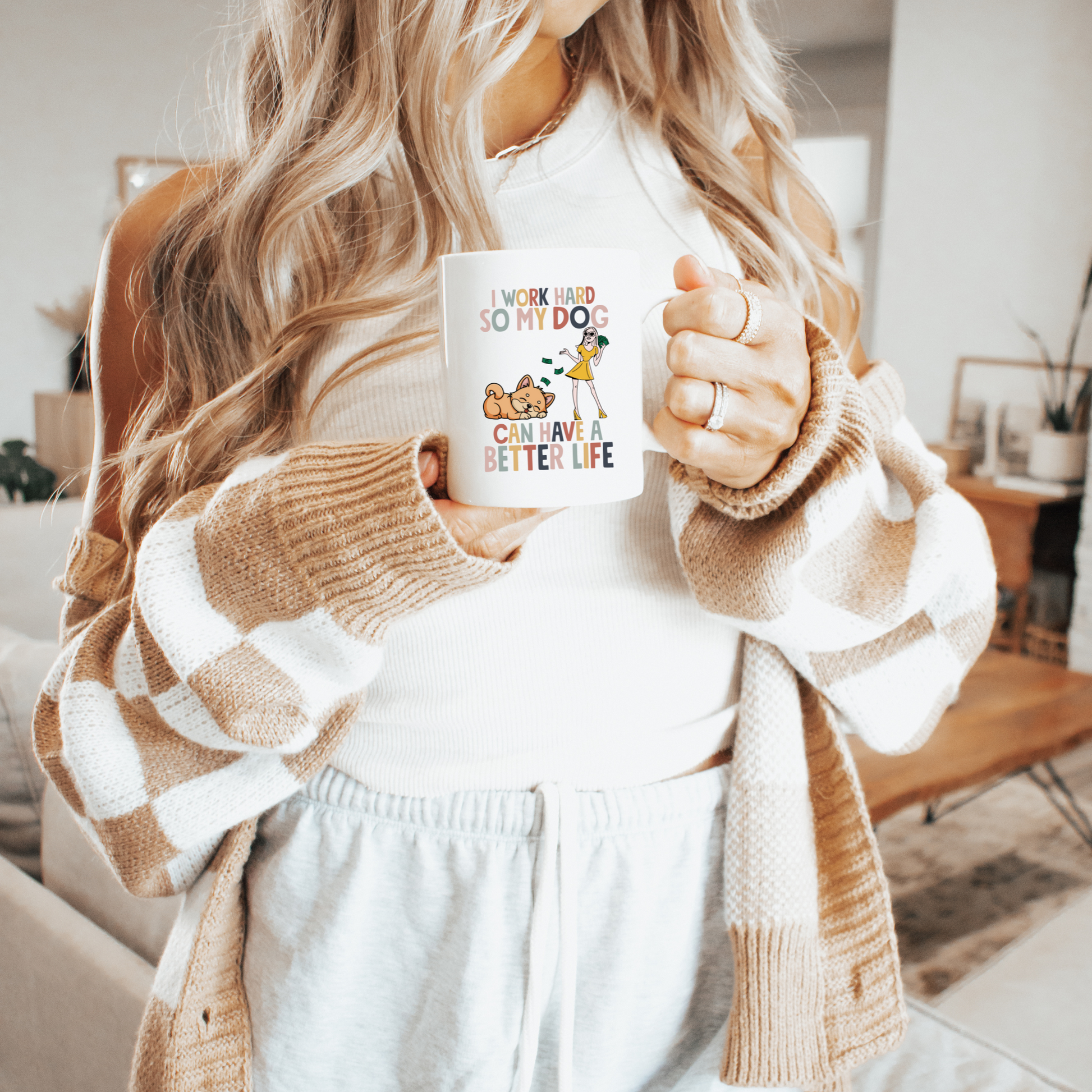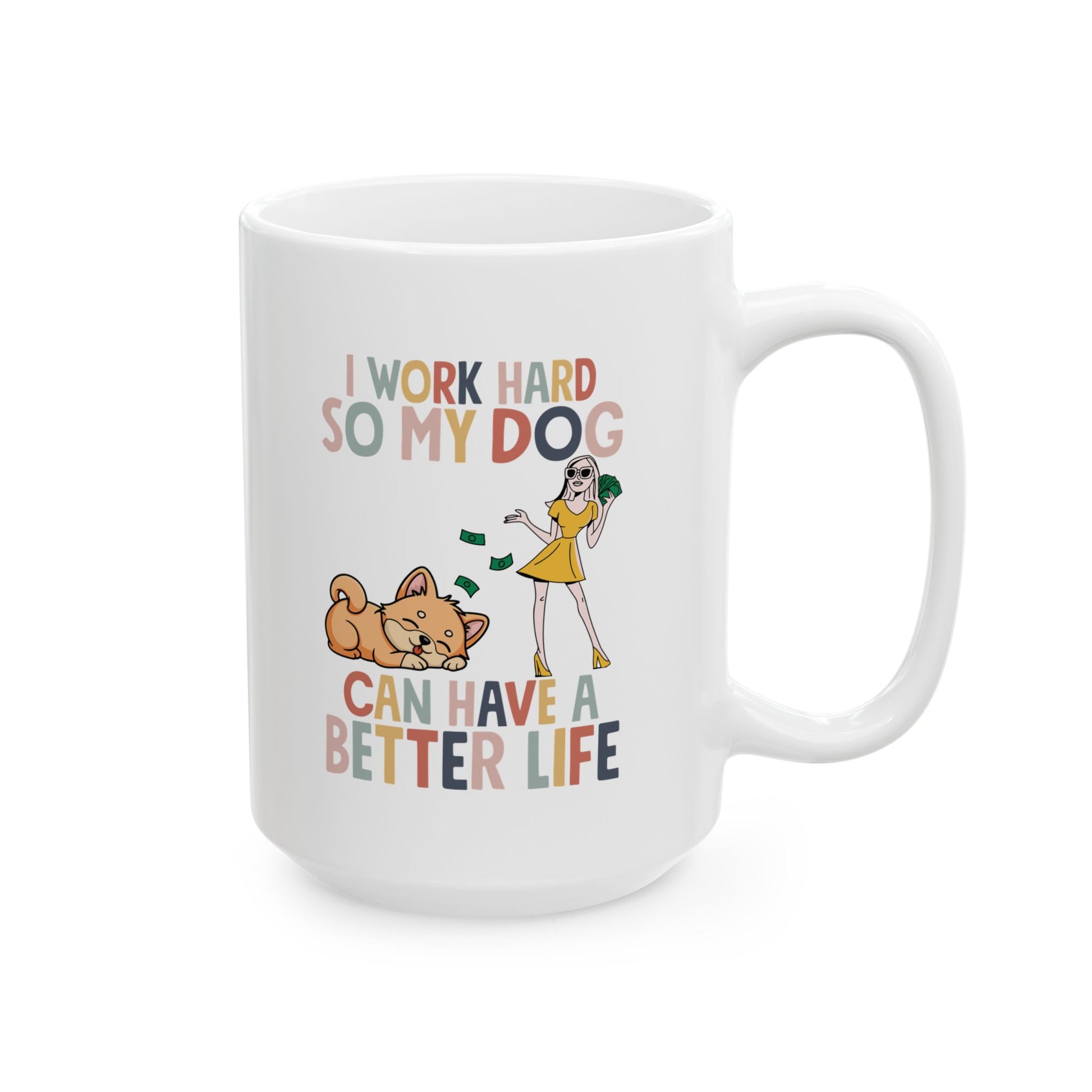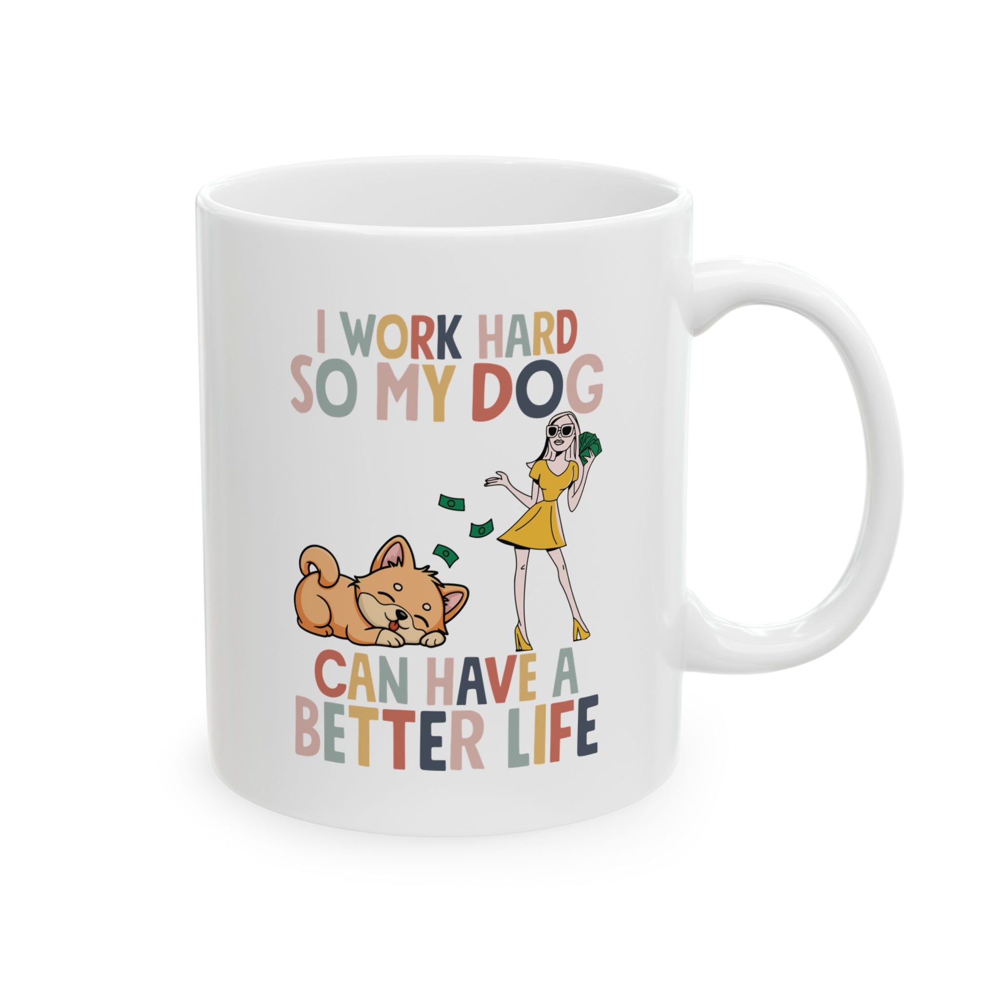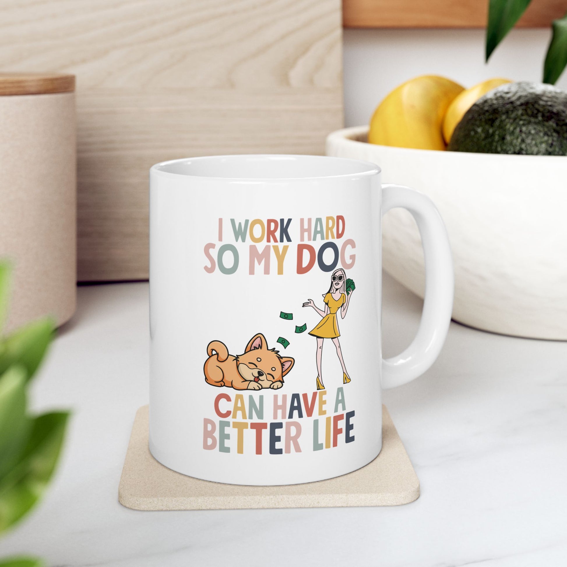Start your day with a smile and a reminder of why you work so hard with this "I Work Hard So My Dog Can Have a Better Life" mug! Made from ceramic, this mug is perfect for dog moms and dads who pour their love (and their coffee!) into giving their pup the best. Whether you're at home or the office, this mug is a fun way to showcase your dedication to your furry friend.