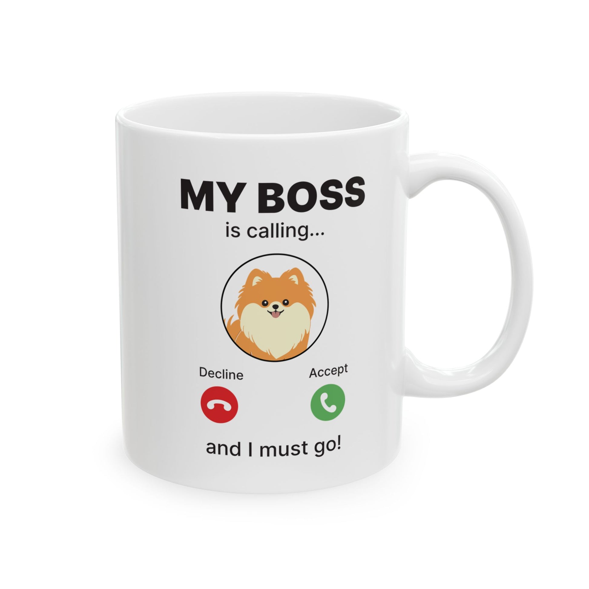 Start your day with a smile and a chuckle with our "My Boss Is Calling ... and I have to go" ceramic mug! Featuring a fun design with a photo avatar of the "boss" (your dog!), this mug is ideal for any dog mom or dad who knows who's really in charge. Available in two sizes (11 oz and 15 oz), this durable ceramic mug is perfect for sipping coffee, tea, or any favorite beverage while celebrating your love for your four-legged friend. Drink confidently on a daily basis as all mugs are lead and BPA-free.