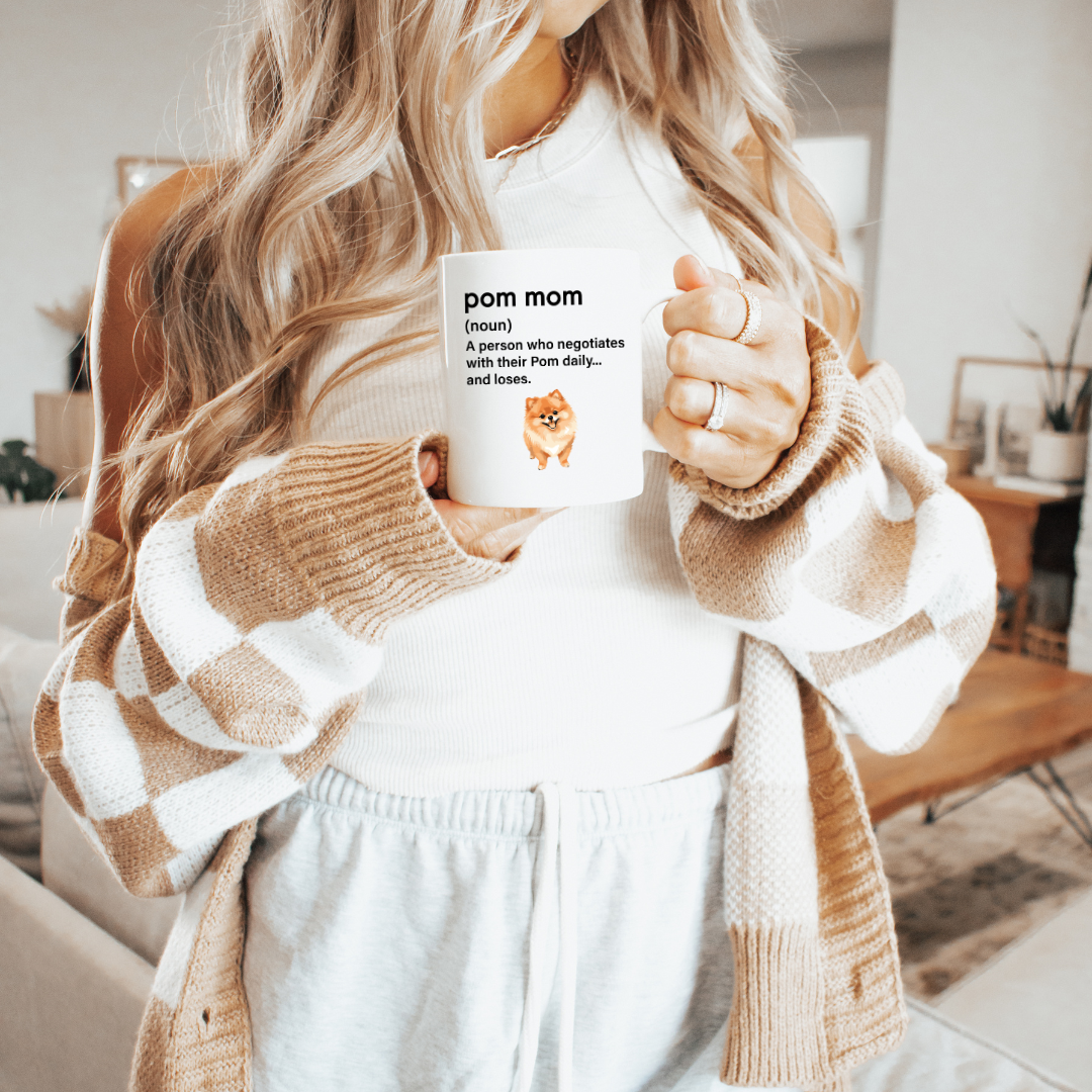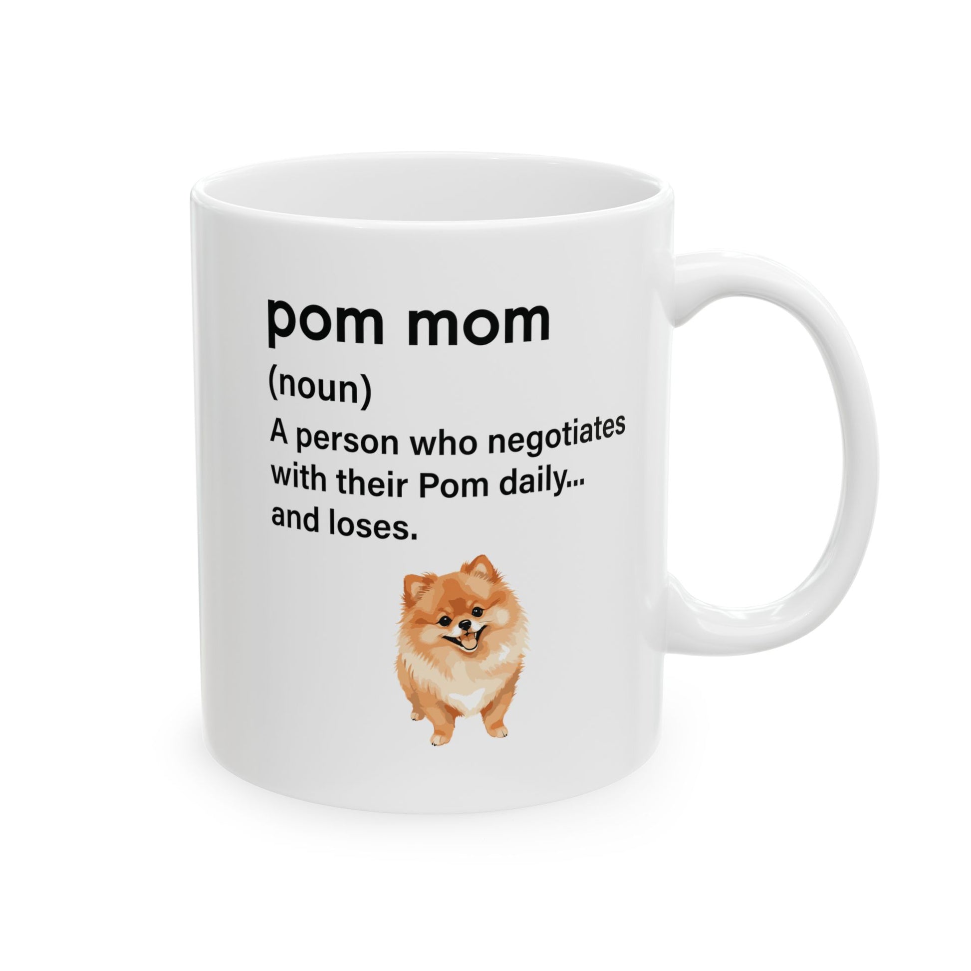 Start your day with a smile (and a little Pom mom humor) with this fun ceramic mug! 😂 Featuring the quote, 'Pom Mom = A Person who negotiates with their Pom daily and fails', this mug is perfect for Pom moms who understand the daily negotiation struggle with their sassy, fluffy companions. Available in two sizes, 11 oz and 15 oz. This mug is designed to hold all the coffee, tea, or hot chocolate you need to keep up with your Pom’s antics. Perfect for home or office, it’s a fun reminder of the joys of being a Pom parent! 🐾