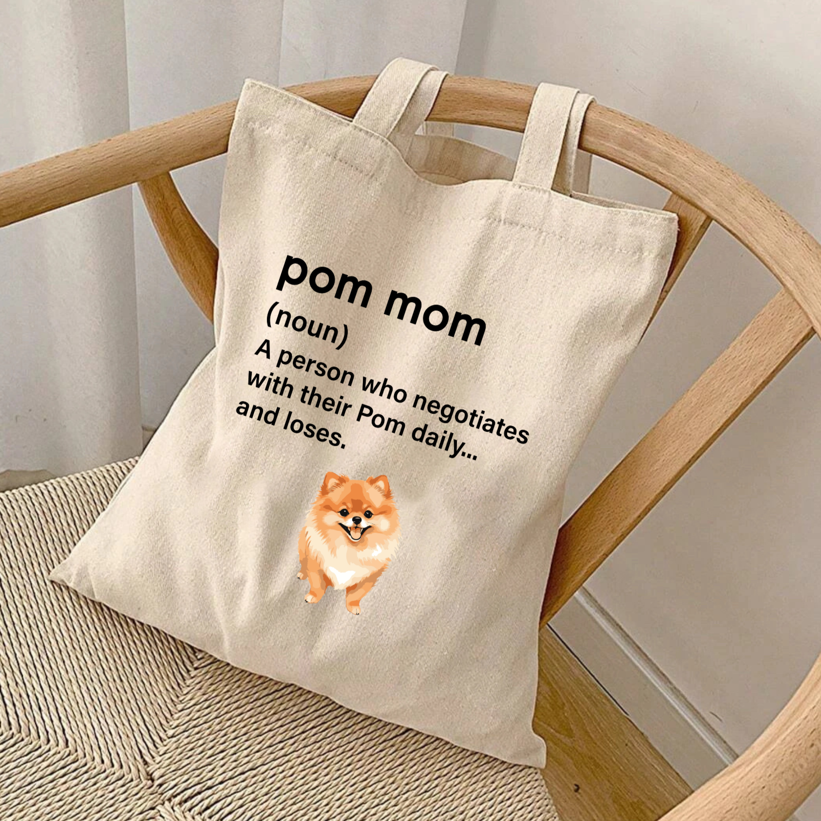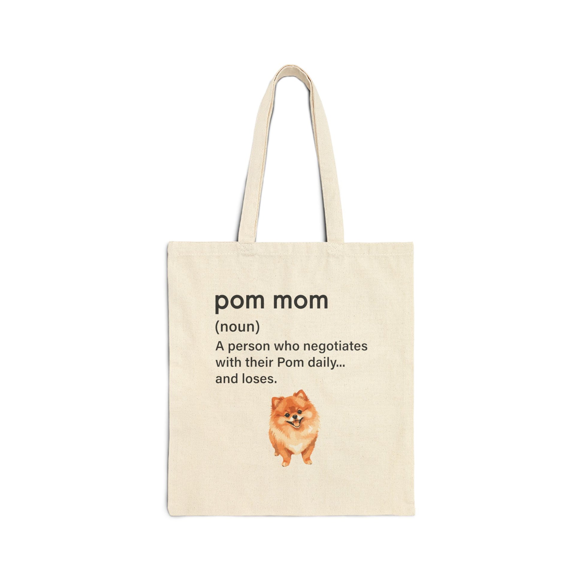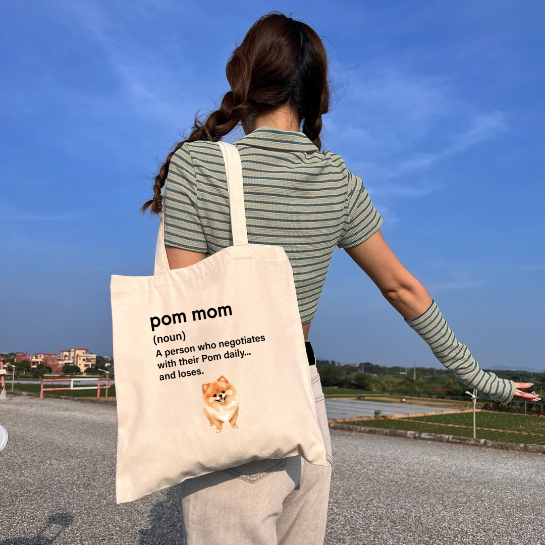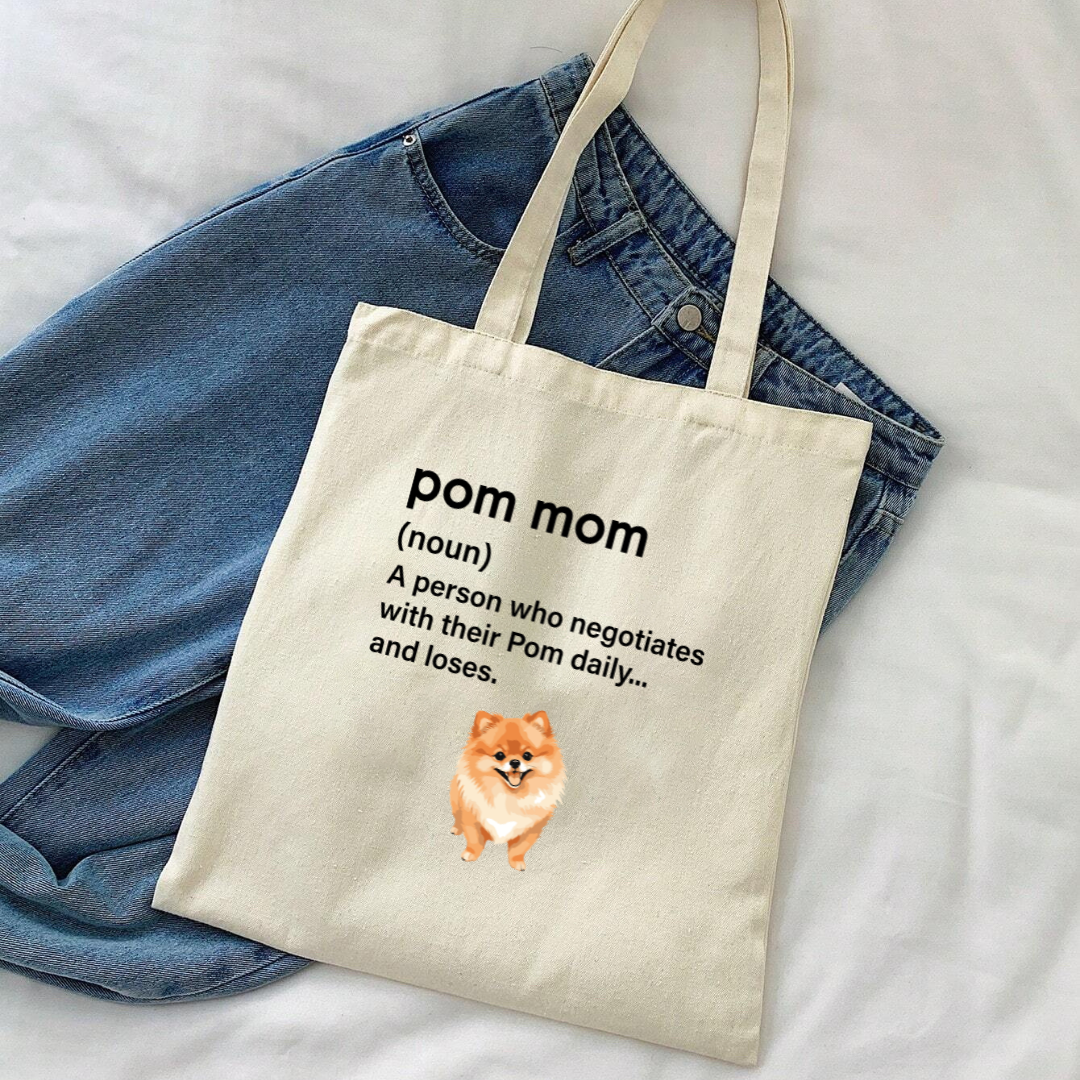 Carry your Pom pride everywhere with this fun and functional tote bag! 😂 Featuring the quote, 'Pom Mom Definition: A person who negotiates with their Pom daily and fails' this tote is perfect for Pom moms who know the struggle of bargaining with their stubborn, fluffy companions. Made from durable, eco-friendly material, it’s ideal for grocery runs, park outings, or carrying all your Pom essentials. Show off your Pom mom humor wherever you go! 🐾